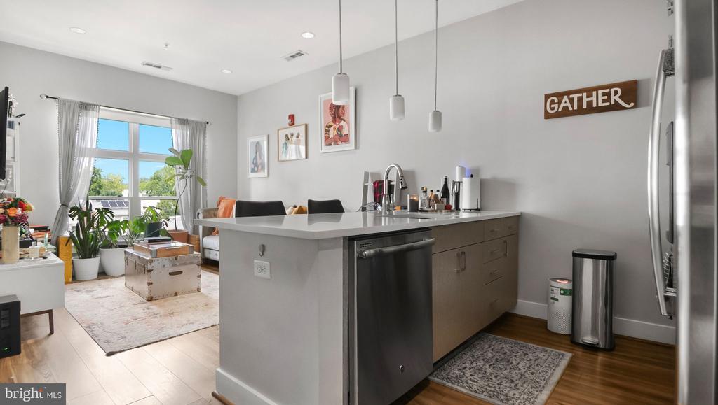Live above it all in Unit 407 at The Corey — a modern, full-service, pet-friendly condo in one of DC’s fastest-rising neighborhoods. This sun-soaked 1-bedroom, 1-bath home includes 1 off-street parking spot and delivers style and function with wide-plank hardwood floors, oversized windows, recessed lighting, and a community rooftop deck perfect for your morning coffee or evening wine. The designer kitchen stuns with quartz countertops, bar seating, stainless steel appliances, and classic subway tile. The bedroom offers ample closet space and natural light, while the sleek bathroom and in-unit washer/dryer round out a perfectly efficient floor plan. One reserved parking space included. Set in a boutique Art Deco-inspired building, The Corey offers elevated amenities including a fitness center, residents' party room perfect for entertaining, secure bike storage, green roof, and a rooftop deck with iconic views of the Capitol and Washington Monument. With a Walk Score of 95, you’re just moments from Union Market, the H Street Corridor, Whole Foods, Trader Joe’s, the DC Streetcar, and NoMa-Gallaudet Metro.