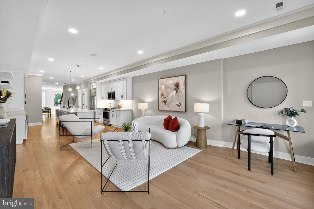 With the feeling or a row home in the sky, inside you will find an open-concept layout filled with natural light, wide-plank hardwood floors, and sophisticated finishes throughout. The gourmet kitchen features quartz countertops, custom cabinetry, and a premium stainless steel appliance suite—ideal for both everyday living and entertaining. The spacious living and dining areas flow effortlessly, providing a warm and inviting atmosphere. With a large open concept family room at the rear with a spacious deck providing even more space for one level entertaining!