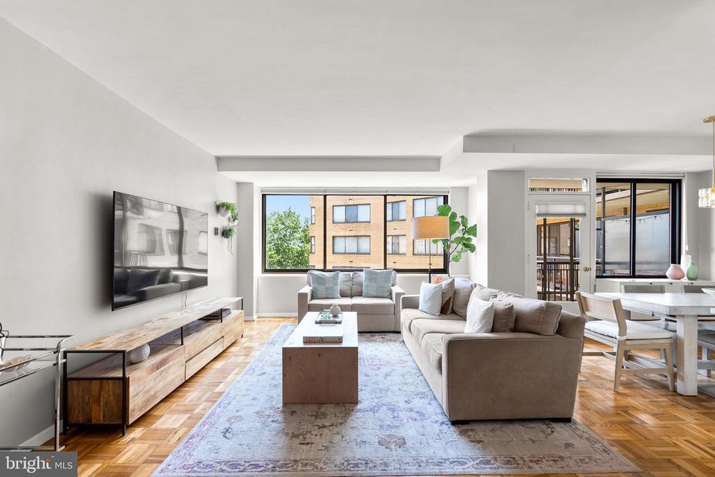 Renovated and filled with natural light, this 2-bedroom, 2-bathroom condominium in the sought-after Essex offers the perfect blend of style, comfort, and convenience—just a short walk to both Van Ness and Tenleytown Metro stations. ALL Utilities Included in the Rent!! Enjoy your morning coffee on the private balcony overlooking a serene, tree-lined street. The state-of-the-art kitchen features custom cabinetry, stainless steel appliances, a subway tile backsplash, quartz countertops, and a tiled floor, opening seamlessly to the dining room with designer lighting and direct balcony access. An expansive living room provides an ideal space for both entertaining and everyday relaxation. The primary suite includes a renovated en-suite bathroom and a generous double closet. Additional highlights include an in-building laundry room just steps from your door, a private roof deck with sweeping views, and 24-hour front desk service.