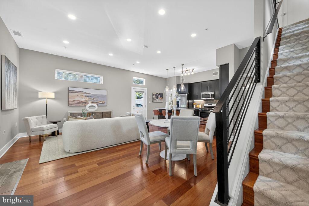 Inside, wide-plank hardwood floors and ten-foot ceilings flow across two levels. At the heart of the home is a designer kitchen with espresso cabinetry, Carrara marble countertops, and stainless steel appliances, opening to a spacious living/dining area designed for easy entertaining. A powder room completes the main floor.