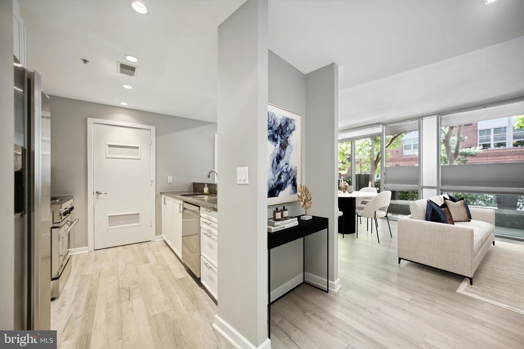 Stunning two-bedroom, two-bath ground-floor unit in the highly sought-after Solo Piazza, perfectly positioned in the heart of Logan Circle. With ample natural light, this beautifully presented residence offers over 1,100 sq ft of well-designed living space, complete with luxury vinyl plank flooring and striking floor-to-ceiling windows. The kitchen, a true chef’s delight, is fitted with white cabinetry, granite worktops, stainless steel appliances, and a breakfast bar for casual dining. The generous family room, centered around a stone-surround gas fireplace, creates a welcoming atmosphere, while a slider door opens to a spacious private patio adorned with large planters, ideal for evening relaxation. A dedicated dining area provides the perfect setting for more formal occasions and entertaining guests. Both bedrooms serve as impressive suites, each with custom Elfa wardrobe fittings and a stylish en-suite bathroom. Additional highlights include a new water heater (2024), HVAC (2021), newer in-unit washer and dryer (2020–2021), excellent storage, and convenient street parking, with optional rental spaces available just a block away. Solo Piazza residents enjoy an array of first-class amenities, including concierge service with secure parcel handling, a serene bamboo courtyard, and a rooftop terrace with patio seating to take in sweeping city views. All this, just blocks from the Mt Vernon/Convention Center Metro (green and yellow lines) and moments from Logan Circle, 14th Street, Whole Foods, cafés, shops, and restaurants. Rent includes water/sewer and access to all the amazing amenities.