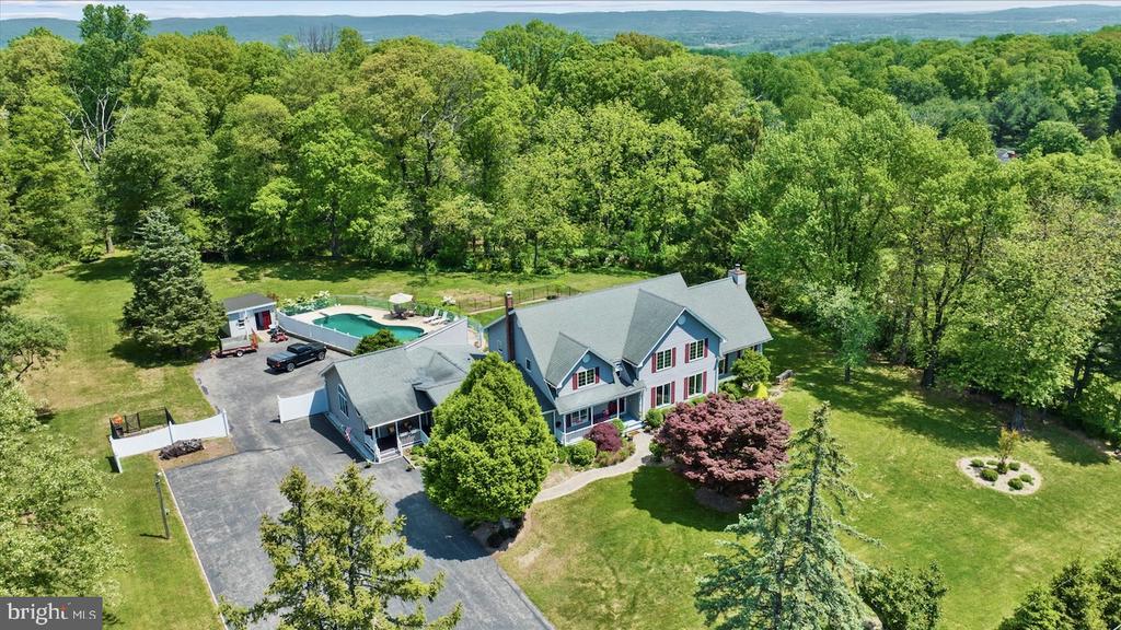 Beautifully built home featuring 4 bedrooms, 3 full baths, and large windows that fill the entire home with natural light. The vaulted great room features a skylight, expansive windows, and a floor-to-ceiling wood-burning fireplace. The updated kitchen includes newer cabinetry, sleek countertops, and modern appliances. A formal dining room and large living room both with ample windows add elegant, sunlit gathering spaces. A first-floor office and partially finished walkout basement offer flexible living options.The stunning primary suite is a private retreat with a tray ceiling, ample closet space, spacious sitting area, Juliet balcony overlooking the great room, and a wall of windows with serene backyard views. The updated ensuite bath adds a luxurious touch. Three additional bedrooms share a full bath with double vanity. Laundry is conveniently located on the upper level.Enjoy a two-tier Trex-style deck, in-ground pool, wooded views, and landscape lighting ideal for entertaining.The ATTACHED IN-LAW SUITE features a private entrance, handicap access, full kitchen, living room, bedroom, 2 baths, private laundry, 2 bonus rooms, and great storage. Skylights and large windows bring in natural light. Separate utilities (except heat). Minutes to Rt. 78. 6-zone heat, 4-zone A/C.