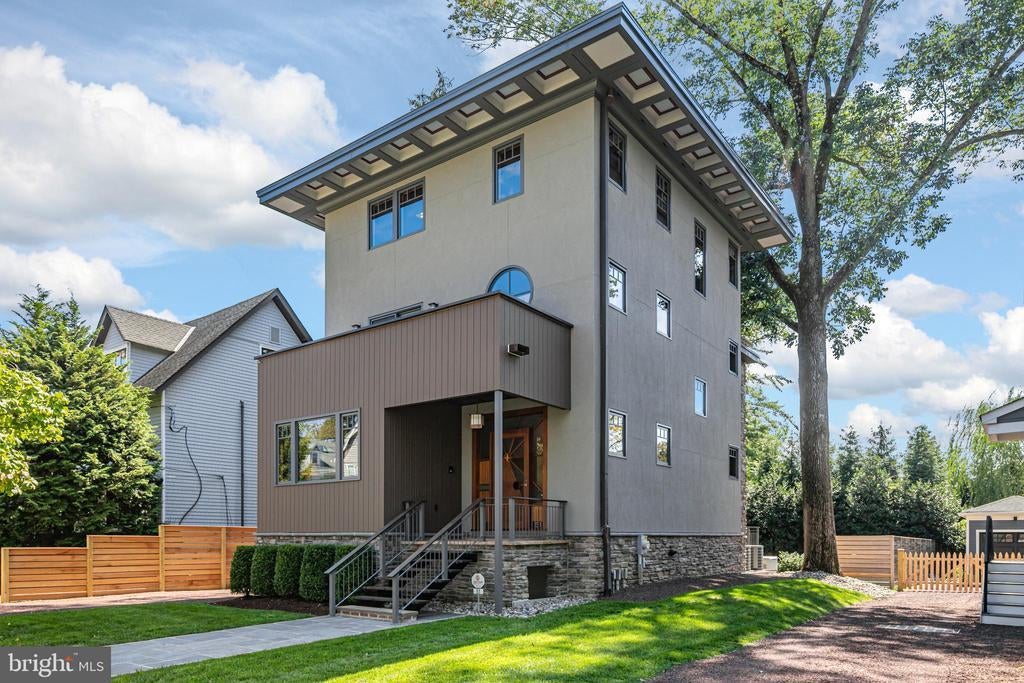 An extraordinary modern home guided by the principles of the Arts and Crafts movement showcases the beauty of natural materials and artisan-made details throughout a meticulously planned interior. Princeton Design Guild completed the project in 2011. Soon after, it was featured on the annual Princeton House Tour, an invitation for all to come appreciate the combination of exotic woods sourced from around the world, as well as lovely treetop views of the historic neighborhood edging Princeton University campus. The memorable details begin right at the front door decorated with celestial-themed inlays. Custom Loewen windows, handsome built-in storage and a stacked stone fireplace set the scene in the living room, which is unmarred by a TV, thanks to an ingenious hidden lift. The kitchen features distinctly grained rainforest marble atop Koa and Zebrawood cabinetry. A charcoal gray Viking range and separate warming drawer, instant hot and filtered water as well as an integrated Miele coffee station are some of the high-end appliances that have been serviced like clockwork. From the dining room, step through extra-tall glass doors to a terrace paved in rainbow sandstone perched above the newly fenced lawn edged with evergreen holly trees. You can also enjoy a view of the streetscape from a balcony off the main bedroom suite. A built-in workstation, a steam shower within the all-marble bath, Electrolux laundry appliances and a completely tricked out dressing room converted from the fourth bedroom make the entire second level a five-star owner’s retreat. The third floor is another destination unto itself with a sprawling rooftop terrace and a lounge area outside two more bedrooms. Down in the clean-as-a-whistle basement, you’ll find plentiful storage and a Savant Smart Home system that controls the climate, Lutron lighting, media and security throughout the whole home, as well as a Generac generator that ensures your comfort is never disrupted. Don’t miss the handy driveway side entry or the outdoor storage alcoves that keep firewood and garbage bins neatly tucked away - further proof that every inch of this in-town home was planned to perfection!