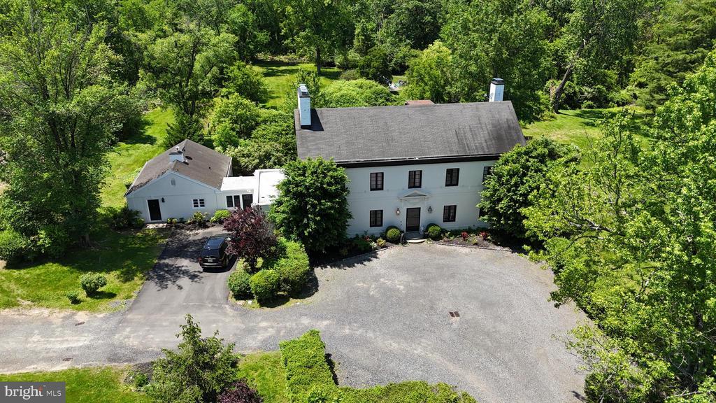 Set on approximately 13 acres of estate-like grounds, this stately colonial offers classic architectural elegance and rare versatility in a premier setting just over the Princeton/Montgomery border. A long drive leads to the main residence which spans three stories and features five bedrooms, including a luxurious primary suite with its own fireplace and balcony. An additional one-bedroom apartment with private entrance and separate utilities, offers ideal accommodations for guests, extended family or live-in help. Graced with four fireplaces, including those in the kitchen, library, living room and primary suite, this home exudes warmth and character throughout. Original details such as pocket doors, French doors, bluestone terraces and refined millwork evoke a bygone era of craftsmanship, while a new kitchen layout with a fabulous center island lends itself beautifully to both grand entertaining and everyday living. A serene pool and accompanying pool house with a full bathroom, kitchen and changing rooms offer an idyllic setting for summer relaxation. The grounds present additional appeal with a three-car detached garage, room for all sorts of gardening and a potential for a minor subdivision, creating a separate six acre building lot without compromising the estate's privacy and grandeur. A truly exceptional offering - rich with character, surrounded by nature, and brimming with opportunity. and located in a top School District with close proximity to all private schools. Recent updates include: 3 zone Lennox Wifi ready hybrid HVAC system, 2 instant tankless hot water heaters, seamless new and refinished original hardwood floors, second floor laundry room and redesigned kitchen/dining room with the creation of a modern mudroom complete with cubbies, storage and charging stations. New septic will be installed once a contract is in place for main house, pool house and apartment. A rare blend of history and beauty, thoughtfully positioned for ideal east-west light - creating an unforgettable home where friends and family will love to gather. The pool, pool house and fireplaces are being conveyed "as-is".