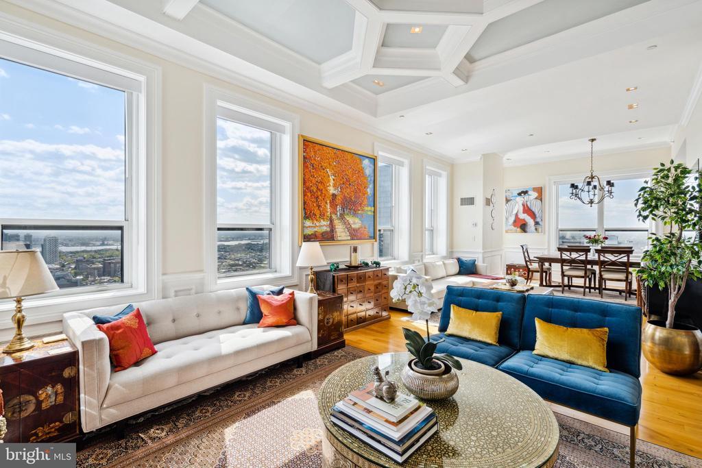 Located on the highest floor of The Aria, Unit 33A is a sprawling two bedroom plus study, two and a half bathroom penthouse with see-forever 360 degree city views from every room, even the bathrooms. From the rich wood floors and high-end selections to the soaring coffered ceilings with intricate details, this residence is one-of-a-kind. Enter into the condominium off of a secure fobbed elevator. There is long gallery hall with domed ceiling and marble tile floor that leads to a light-filled great room with walls of oversized windows showcasing see-forever sunrise city views over the river, an electric fireplace with glass built-ins, and spacious living and dining areas, perfect for open-concept living. Off of the great room is the study, which has tons of natural light, gorgeous woodwork and trim, custom built-ins, and beautiful pocket doors for privacy. The designer kitchen enjoys sleek white cabinetry, dark granite countertops, gray tile backsplash, large pantry, breakfast bar, and stainless steel appliances including a Sub-Zero refrigerator, Bosch dishwasher, and Viking oven with gas range and Zephyr hood. One of the most desirable features of this home is the lavish primary suite that enjoys a sitting area, incredible closet space, including multiple walk-in closets and wall closets, all with custom built-ins, and an ensuite marble-appointed bath with double vanity, glass enclosed walk-in shower, soaking tub, and sunset views. The guest bedroom suite is privately situated on the opposite side of the residence and enjoys a full ensuite bathroom with upgraded vanity and glass enclosed stall shower. Additional home highlights include a powder room with floor-to-ceiling tilework, a laundry closet with storage space and Bosch stackable washer/dryer, a trash chute within a closet off of the entrance hall, exquisite moldings and trim, unimaginable closet space, and a 300 sf storage unit in the basement- the largest unit in the building. Residents enjoy a state-of-the-art fitness center, a spacious entertaining suite with thoughtfully appointed kitchen, a meeting & conference center, lounge, 24-hr concierge, parking, storage in basement and a luxurious pet spa with special services. Located in the Rittenhouse Square neighborhood, The Aria residents will appreciate living in the heart of the city’s cultural epicenter, with world class shopping & gourmet dining. Penthouse units are above the 30th floor and feature 360 Degree views.