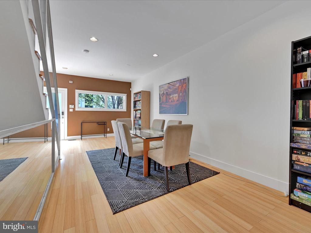 Step into the contemporary dining space where sleek bamboo flooring flows seamlessly through the main living areas. With soaring 10-foot ceilings throughout, the home feels bright, open, and inviting at every turn. The main living level leads to a luminous kitchen equipped with stainless steel appliances, a chic island that seats four, and a dramatic metallic tile backsplash that adds the perfect urban flair.