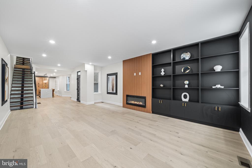 Step inside and you’ll immediately feel the elegance and flow , wide-plank designer flooring, custom architectural details, and sun-filled living spaces set the tone for refined city living. The living area highlights a wood slat-accent feature wall, sleek linear fireplace, and built-in shelving, blending comfort with contemporary style.