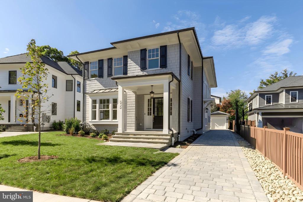 The exterior makes a charming first impression, with gray Hardie shingles, crisp white trim, and dark shutters evoking the quiet luxury of a Nantucket summer cottage. A deep paver driveway along the side leads discreetly to a private detached garage at the rear of the property. The entry, tucked beneath a welcoming portico, opens into a dedicated reception area, with a light-filled den situated just off to one side.