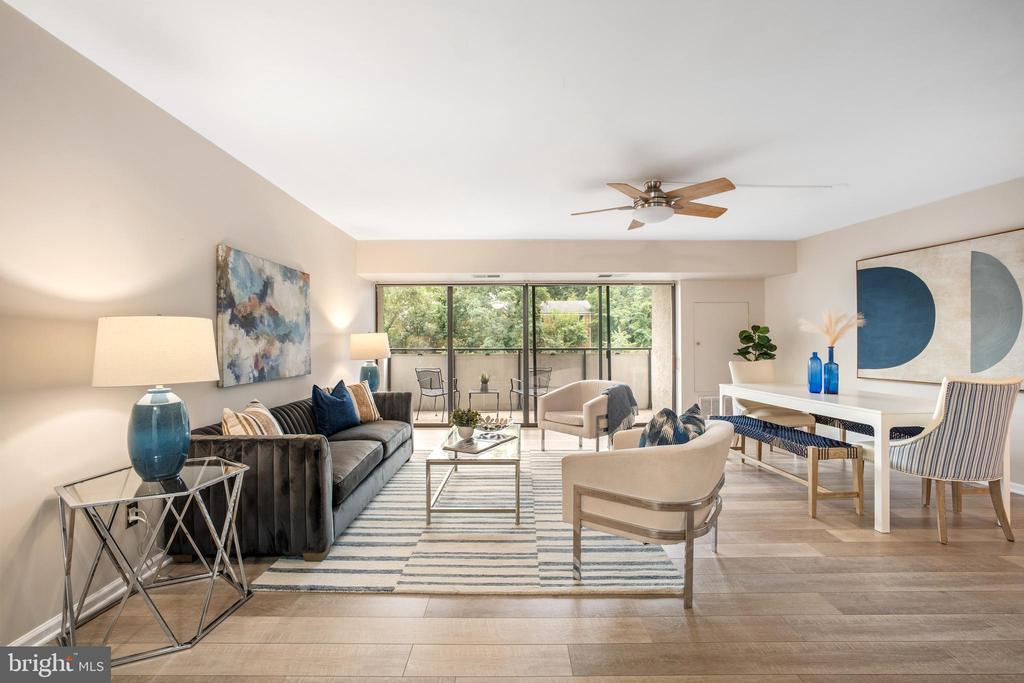 This light-filled condo offers an open floor plan with a spacious living and dining area that flows to an oversized balcony spanning the length of the unit, perfect for entertaining or relaxing with peaceful views of trees, upgraded landscaping, and the pool. Newly installed waterproof engineered hardwood floors run throughout, complementing the stylish kitchen with upgraded cabinets, granite countertops, stainless steel appliances, and table space. The generous primary suite features room for a sitting or office area, balcony access, a large walk-in closet, and an updated en-suite bath, while the half bath has also been refreshed. Additional conveniences include a full-size washer/dryer, one assigned garage parking space close to the access door, and a storage room. Residents enjoy a wide range of amenities such as a fitness center, tennis/sport court, outdoor pool, spacious courtyard with BBQ, party room, elegant updated lobby, and concierge services. Ideally located in the heart of Columbia Pike, the community is minutes to Glencarlyn Park, Four Mile Run and W&OD trails, Arlington Mill Community Center, shopping, dining, Pentagon City, and Downtown DC with direct bus service right outside the building. Pet-friendly (small pets; service/comfort dogs only) and smoke-free.